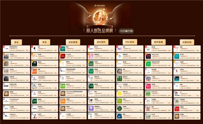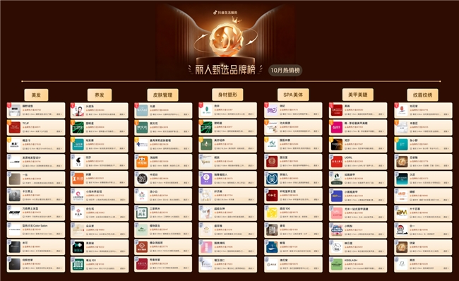 近日,抖音生活服务丽人行业正式推出「10月丽人甄选品牌榜」,覆盖美发、养发、皮肤管理、身材塑形、SPA 美体、美甲美睫、纹眉纹绣七大丽人细分品类,同步设置热销榜、飙升榜两大核心赛道。榜单凭借平台亿级用户真实消费数据与多维严选标准,既为消费者提供一站式优质丽人服务决策指南,有效降低选店决策成本,也通过全链路资源赋能助推上榜品牌实现声量与生意的双重增长,进一步夯实抖音生活服务在丽人领域的行业引领地位。